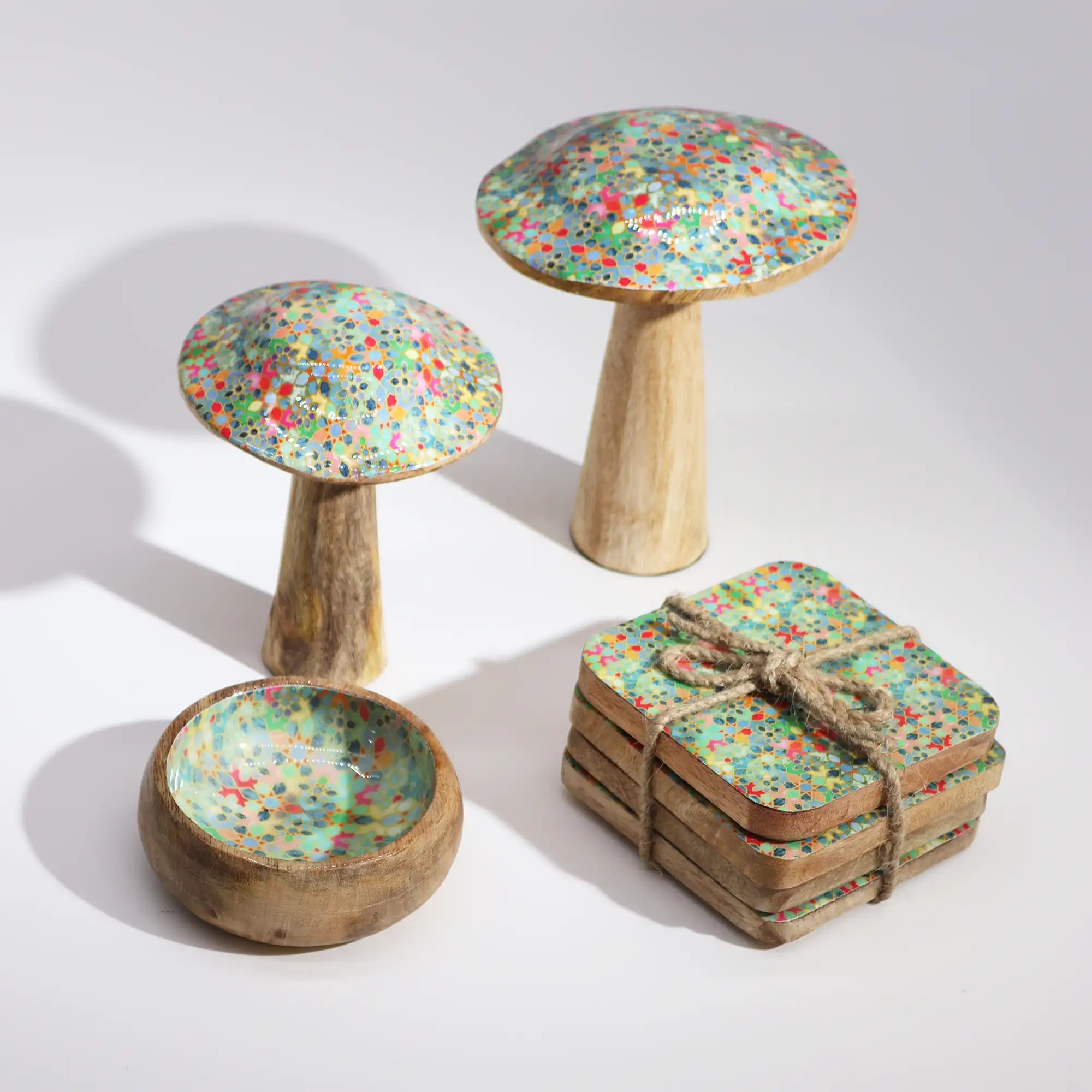 Bring a touch of nature's magic into your home with our adorable Handmade Medium Wooden Mushroom Decoration. Crafted from sustainable mango wood, this delightful piece features a beautifully painted floral design on its cap, adding a pop of color and personality to any space. Key Features: Natural Materials: Made from eco-friendly mango wood. Hand-Painted Detail: Each mushroom boasts a unique, hand-painted floral design. Charming Accent: Perfect for adding a whimsical touch to shelves, tables, or any surface. Versatile Decor: Complements a variety of décor styles, from rustic to modern. This charming mushroom decoration is more than just a decorative item; it's a small piece of art that will bring joy and a touch of the outdoors into your home. Add a touch of playful elegance with this delightful wooden mushroom gift!